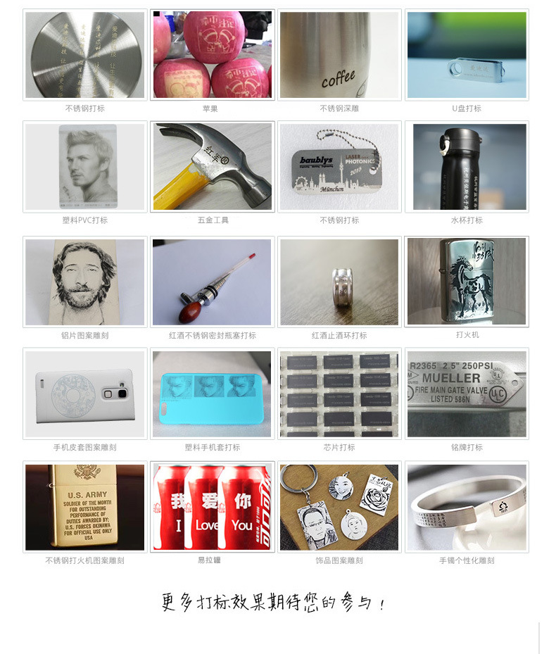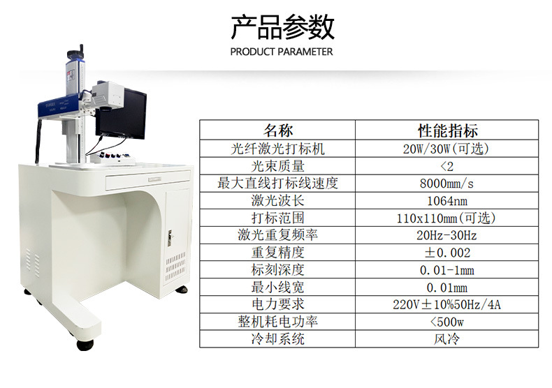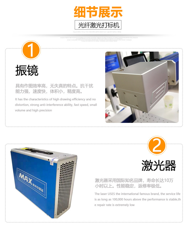 光纖激光打標機采用光纖激光器,振鏡掃描系統,輸出功率穩定,光學模式好,光束質量優異、打標速度快,效果好,效率高,能充分滿足客戶大批量生產需求。